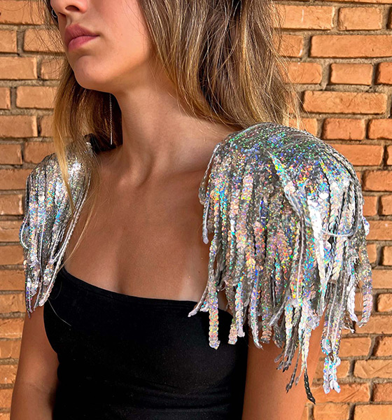 Ombreira confeccionada com fios de lantejoulas prata irizada