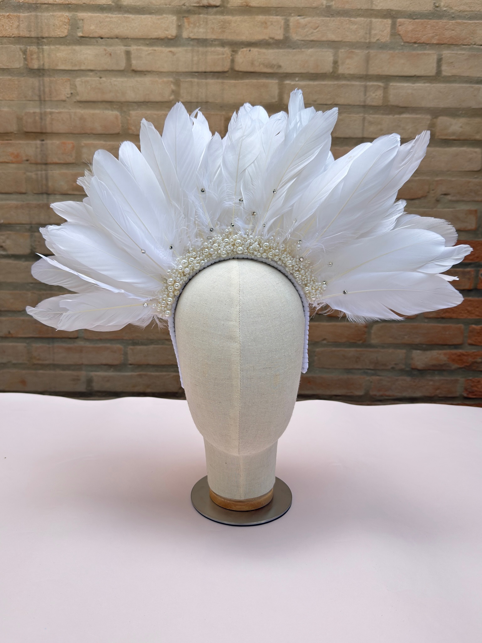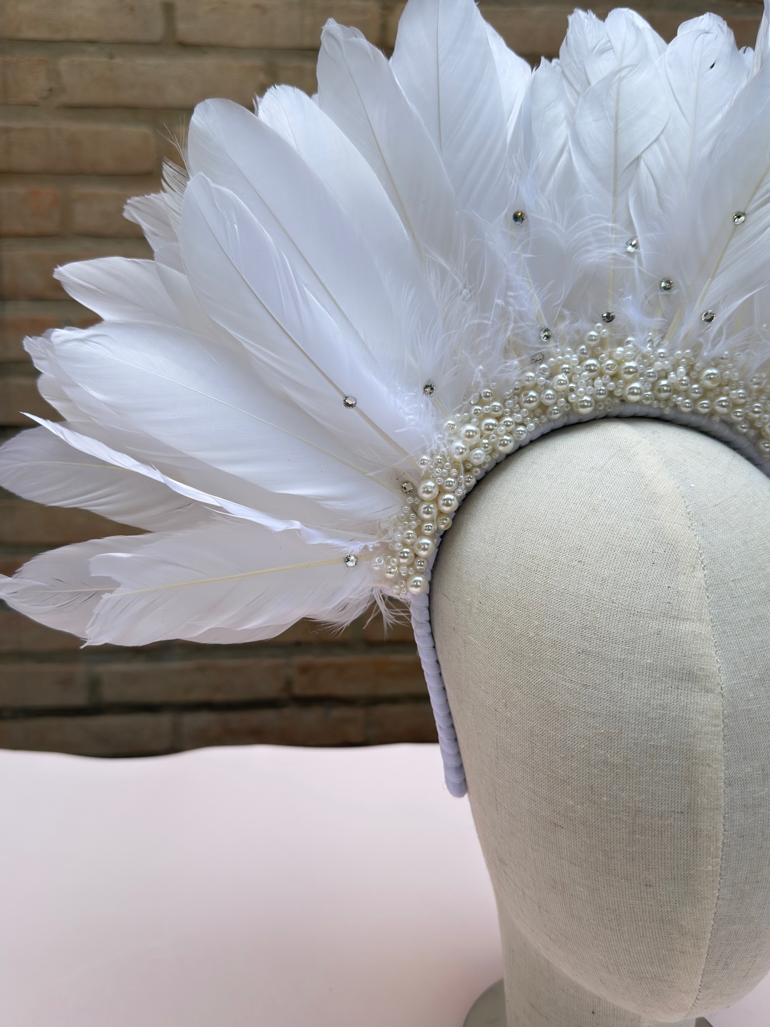 Tiara com penas brancas, pérolas e strass.