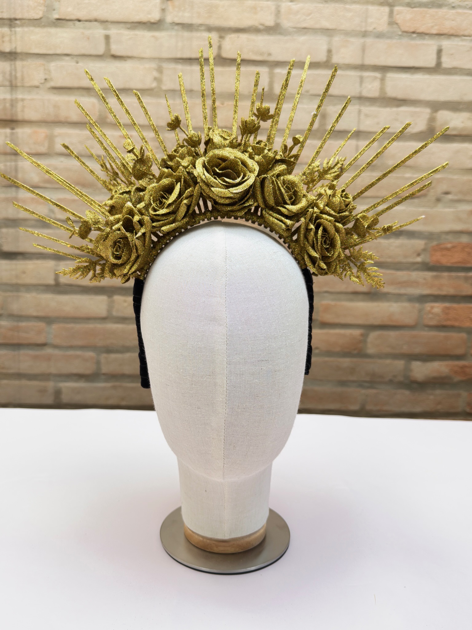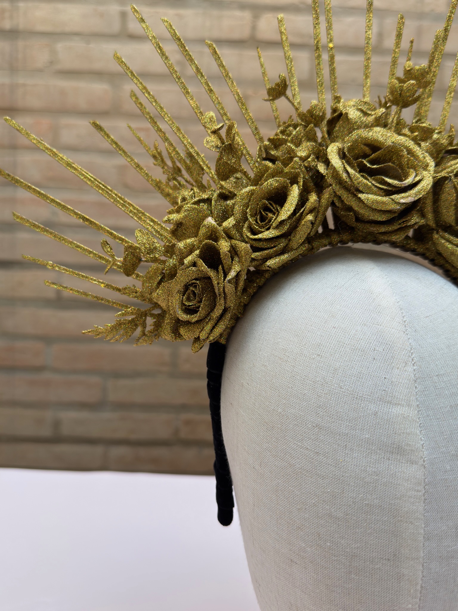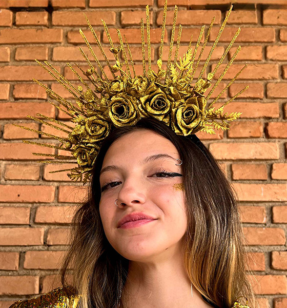 Tiara com flores e muito glitter dourado